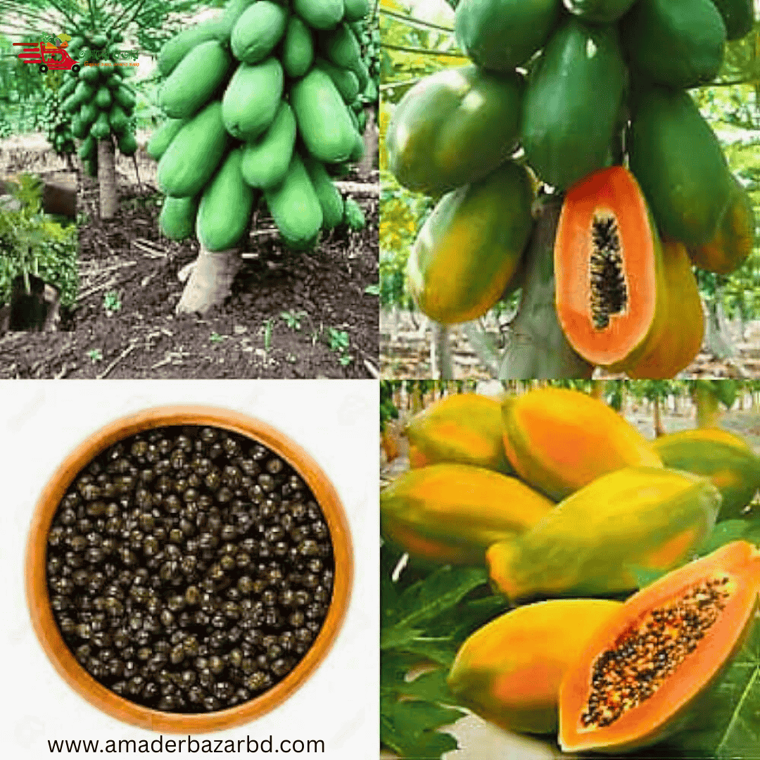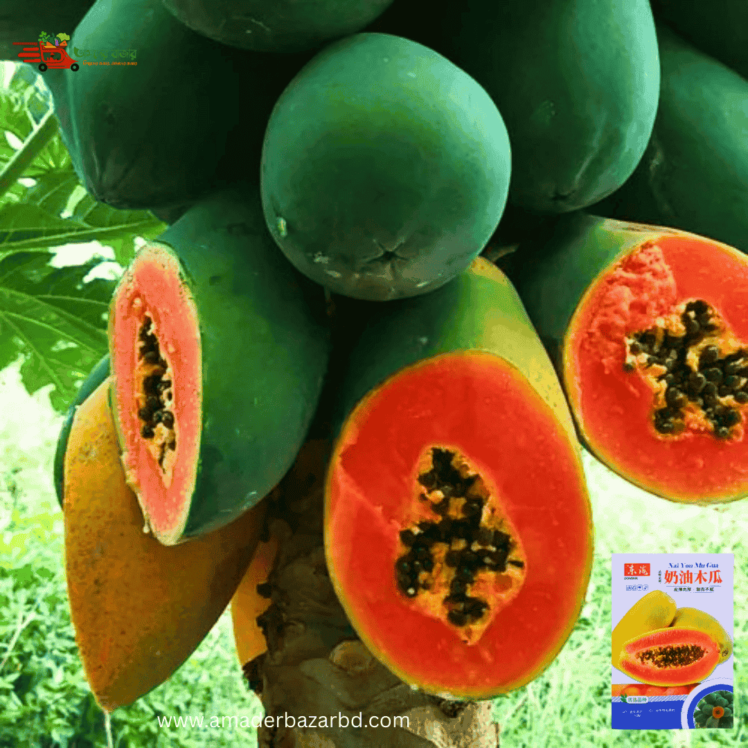 ইমপোর্টেড Milk Papaya – পেঁপে (প্রায় ৫০ বীজ) পাকা হলে খোসা হলুদ-কমলা, ভিতরের শাঁস ক্রিমি ও গাঢ় কমলা/লালচে কমলা। শাঁস নরম, মিষ্টি ও সুগন্ধি, কম আঁশযুক্ত। ফল সাধারণত ডিম্বাকার বা লম্বাটে, আকর্ষণীয় রঙ ও আকৃতি; স্বাদে মিষ্টি এবং বাজারে দ্রুত গ্রহণযোগ্য।