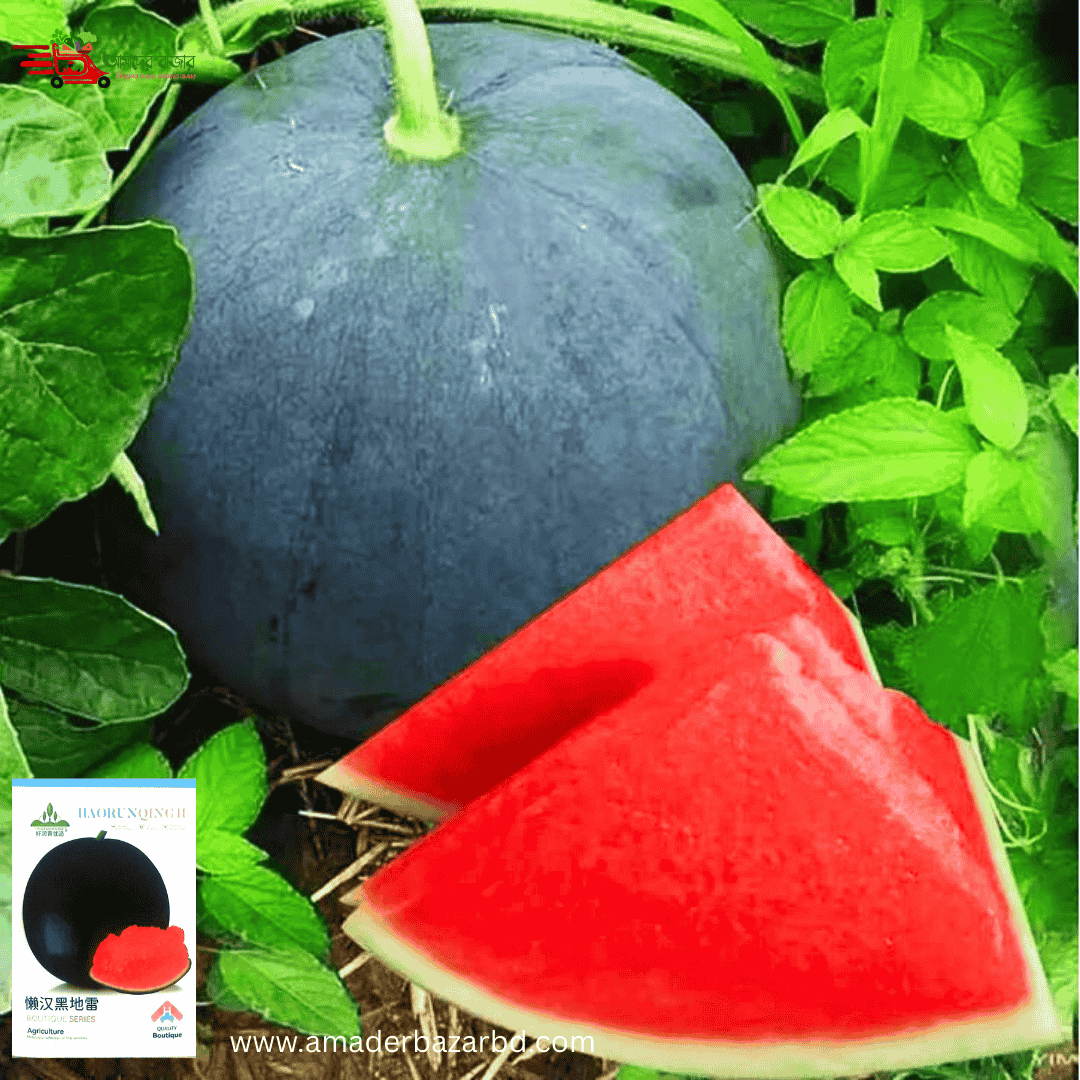 Lazy Han Black Thunder Watermelon – কালো তরমুজ (প্রায় ৪৫-৫০ বীজ) ফল মাঝারি থেকে বড় আকারের, গোলাকার ও আকর্ষণীয় আকৃতির। খোসা সম্পূর্ণ গাঢ় কালো এবং ভেতরের শাঁস উজ্জ্বল লাল, দেখতে ও স্বাদে অত্যন্ত আকর্ষণীয়। প্রতিটি ফলের গড় ওজন প্রায় ৪–৬ কেজি। আকর্ষণীয় কালো খোসা, অত্যন্ত মিষ্টি, ঘন ও রসালো- চমৎকার বাজার চাহিদা।