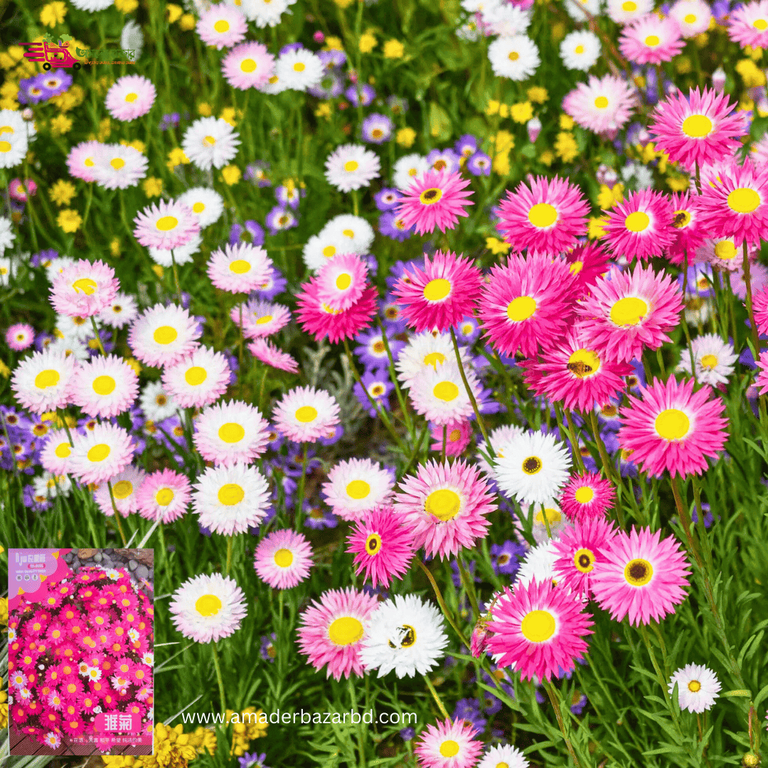 Daisy Flower – ছোট চন্দ্রমল্লিকা ফুল (প্রায় ৫০০ বীজ) পাপড়িগুলো বৃত্তাকৃতি কেন্দ্রের চারপাশে সাজানো থাকে→ দেখতে সূর্যের মতো। ফুলগুলো সাধারণত সাদা, গোলাপি, লাল এবং মিশ্র রঙে ফোটে- ক্লাসিক ডেইজি লুক। এক গাছে অনেকগুলো ফুল একসাথে ফোটে→ (২–৩ মাস পর্যন্ত)।