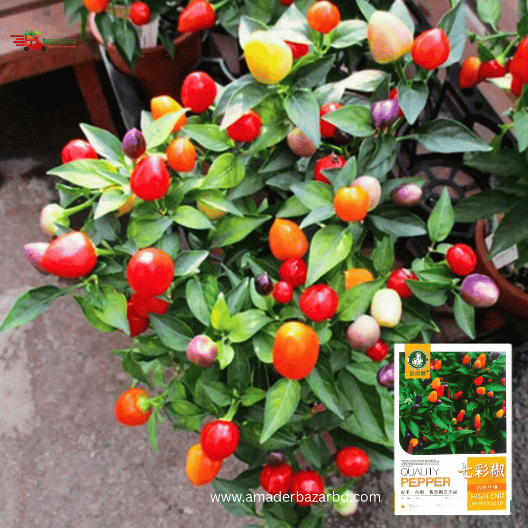 এটি চীনের জনপ্রিয় 七彩椒 (Qicai Jiao) or Rainbow Chili / Multi-Color Ornamental Pepper-এর উচ্চমানের বীজ। Rainbow Chili বা Multi-Color Ornamental Pepper হলো এক ধরনের রঙিন, সুন্দর ও আকর্ষণীয় মরিচের জাত। সাধারণ মরিচের মতোই গাছে ফল ধরে, তবে এর দারুণ বৈশিষ্ট্য হলো—একই গাছে একসাথে একাধিক রঙের ফল দেখা যায়। এজন্যই একে “রেইনবো চিলি” বলা হয়।