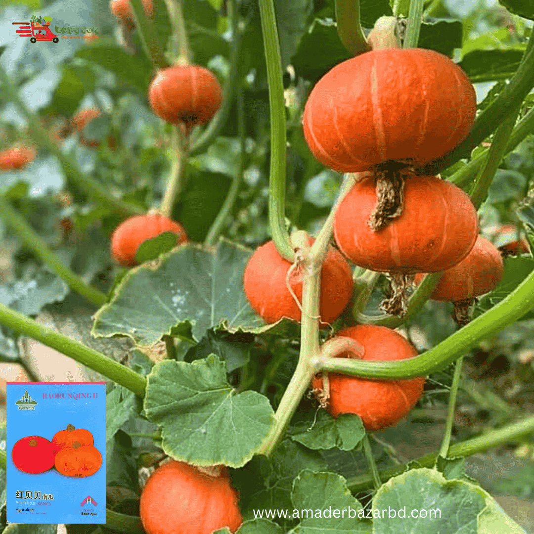 বিদেশী Red Baby Pumpkin (প্রায় ১০–১২ বীজ) আকর্ষণীয় ছোট আকারের কুমড়া, যার খোসা উজ্জ্বল লাল/কমলা এবং ভেতরের শাঁস গাঢ় কমলা, ঘন ও মিষ্টি। প্রতি গাছে ৩–৬টি কুমড়া ধরে এবং গড় ওজন প্রায় ১–১.৫ কেজি। উচ্চ অঙ্কুরোদ্গম হার ও বিদেশি জাত যা প্রতি গিটে গিটে কুমড়া ধরে- অল্প সময়ে বেশি ফলন।