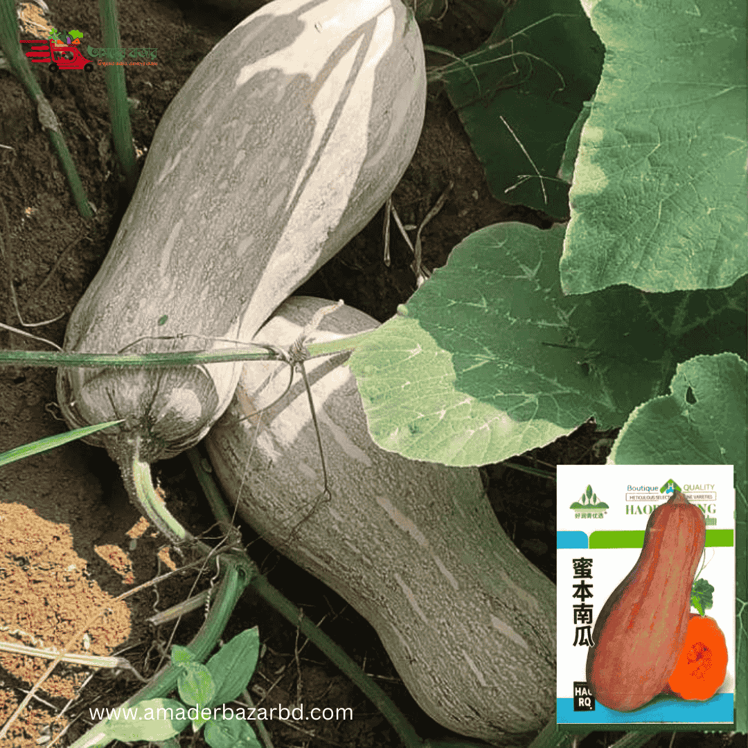 Chinese Honey Pumpkin- মিষ্টি কুমড়া (প্রায় ৬০-৬৫ বীজ) চীনের উন্নত গবেষণায় উদ্ভাবিত এই প্রিমিয়াম কুমড়াটি লম্বাটে ও আকর্ষণীয় আকৃতির। গাঢ় কমলা, ঘন ও মধুমিষ্টি শাঁস এবং মাঝারি থেকে শক্ত খোসা। প্রতিটি কুমড়ার ওজন প্রায় ১.৫–৩ কেজি ও গাছ প্রতি ফলন ৩–৬টি কুমড়া।